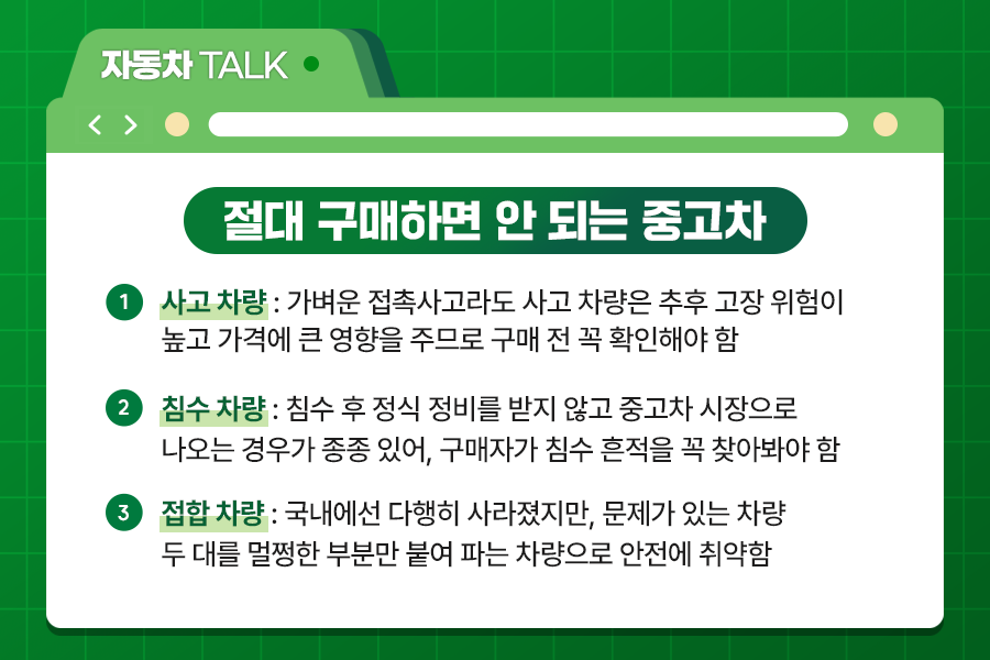 중고차 구매 요령 중 또 하나는 절대 구매하면 안 되는 차량도 구분할 수 있어야 하는데요. 구입하는 중고차 중 가장 피해야 하는 차량은 바로 사고 차량, 침수 차량, 접합 차량입니다. 최근엔 예전과 달리 주행거리 조작은 많이 없어졌습니다. 정비 이력, 검사 이력, 보험 이력 등 주행거리를 기록한 중간 과정이 많고 디지털 방식으로 바뀌면서 조작 자체도 쉽지 않기 때문이지요.