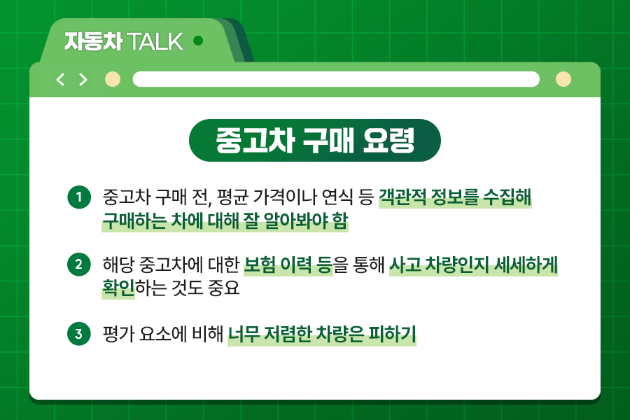 중고차 구입은 꼭 중고차 매매점에서 구매해야 합니다. 중고차가 매입된 정식 매매점에서 구입해야 법정 품질보증도 받을 수 있으며, 나중 문제가 발생할 경우 소비자 보호도 가능합니다. 특히 구입할 때 자동차를 잘 아는 사람과 대동하면 좋고요. 성능·상태 점검기록부 사본에 거래하는 딜러 이름과 날인 그리고 해당 업소명 등 이상이 없는지 확실히 확인해야 합니다. 엔진룸도 열어보고 가능하다면 짧은 거리라도 운전해 보는 것도 좋죠. 이렇게 구매할 제품을 세세히 따져보는 것도 중고차 구매 요령 중 하나겠네요.