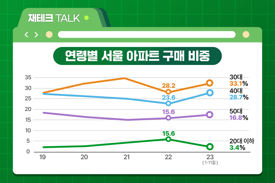 특히 2024년 집값 흐름은 기준금리에 달려있는데요. 한미 기준금리 격차를 고려하면 큰 폭으로 금리가 내려가긴 쉽지 않아 보입니다. 그런데 이런 상황에서 여전히 부동산 시장에서 30대가 ‘큰손’이라는 뉴스가 유독 눈에 띕니다. 심지어 서울 아파트를 비롯한 전국 아파트 매입 비중에서 30대가 2019년 조사 이래 역대 최대치를 기록했다고 합니다. 이는 아파트 영끌 주축인 30대가 금리 인상과 집값 하락의 영향을 받지 않고 여전히 건재하다는 의미일까요?