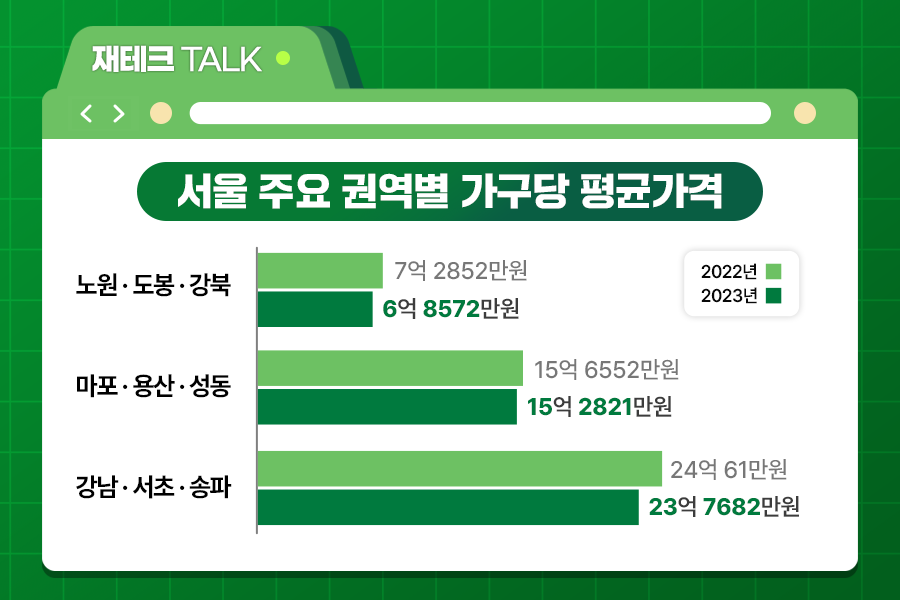 위의 표를 보시면 잘 아시겠지만, 대표적인 ‘영끌 집중 지역’이라 불리는 서울 도봉구, 관악구, 강북구, 구로구, 노원구의 아파트 하락세가 두드러지게 나타나고 있는데요. 노도강(노원, 도봉, 강북구) 가구당 평균 아파트 가격은 2022년 7억 2,825만 원에서 2023년 6억 8,572만 원으로 5.8% 감소했습니다. 마용성(마포, 용산, 성동)은 2.38%, 강남 3구(서초, 강남, 송파)는 0.99% 하락에 그쳤습니다. 아파트 영끌족이 하락 거래를 주도하면서 눈물의 던지기를 하는 것입니다.