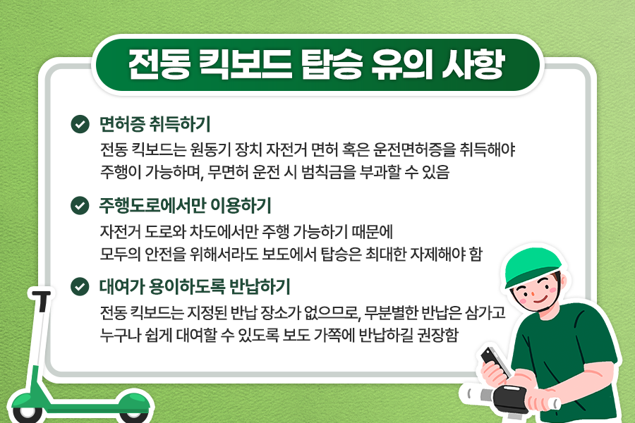 그럼 전동 킥보드를 보다 더 안전하게 탑승하기 위해 주행자가 반드시 알아야 할 유의 사항은 무엇일까요? 전동 킥보드 탑승을 위해선 반드시 전동 킥보드 면허증을 취득해야 합니다. 전동 킥보드 면허증은 만 16세 이상부터 취득할 수 있는 원동기 장치 자전거 면허 혹은 운전면허증이면 됩니다. 만 16세 미만이거나 무면허로 주행할 시 10만 원의 범칙금 혹은 과태료가 부과될 수 있답니다.