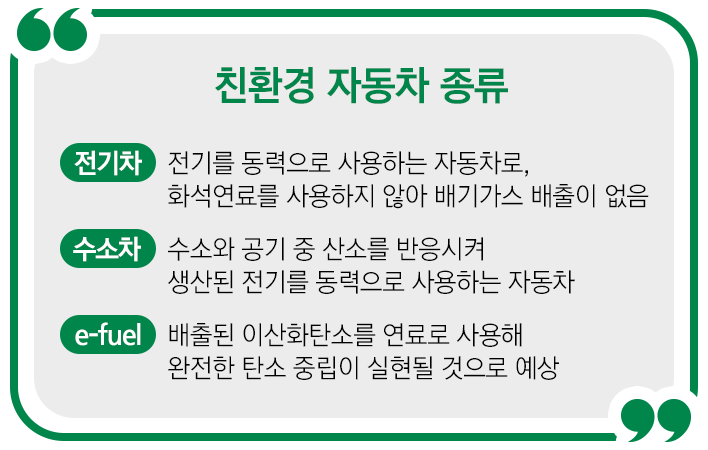 그럼 여기서, 친환경 자동차란 무엇일까요? 휘발유, 경유와 같이 화석 연료로 주행하는 기존 자동차와 달리 전기, 수소 등을 사용하여 주행하는 자동차를 말합니다. 화석 연료를 사용하는 자동차는 배기관을 통해 이산화탄소가 배출되고 이는 온실 효과를 유발하여 지구온난화를 가속시키는 원인이지요. 이외에도 공해물질인 일산화질소, 이산화질소 등이 배출돼 사람과 지구 환경에 모두 좋지 않은 영향을 끼치는데요. 친환경 자동차는 화석 연료를 사용하지 않기 때문에 대기오염물질과 온실가스 배출량이 적습니다. 그래서 친환경 자동차 혹은 그린카라고도 불린답니다.