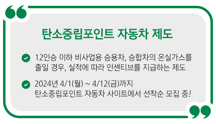탄소중립포인트 자동차 제도는 현재 1차는 마감된 상태고요. 2차 모집을 받고 있습니다. 24년 4/1(월)~4/12(금)까지 선착순으로 받고 있으니, 자세한 내용은 탄소중립포인트 자동차 홈페이지에서 확인해 주세요!