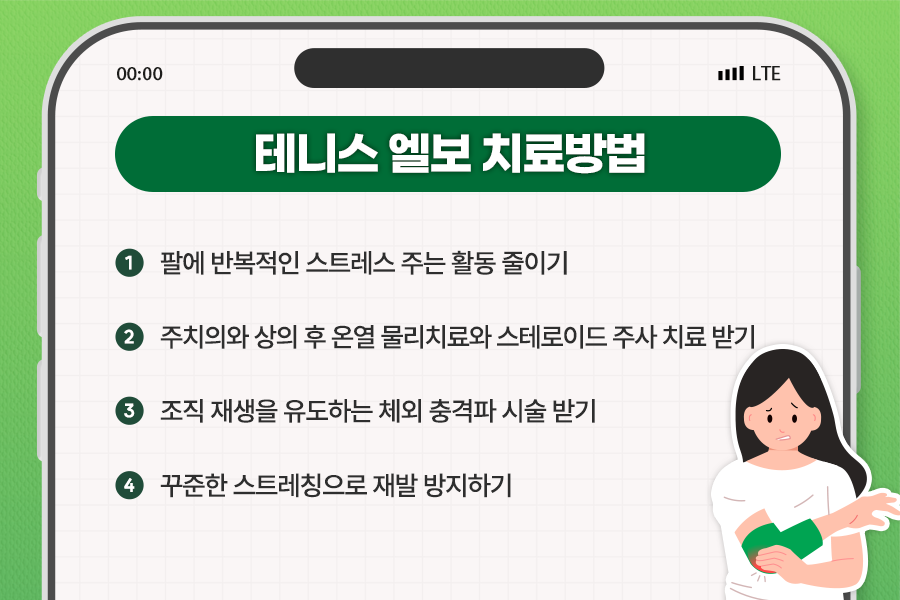 그렇다면 테니스 엘보와 같은 관절 질환은 어떻게 치료해야 할까요? 첫 번째는 몸에 반복적인 스트레스를 주는 활동을 줄이는 것입니다. 팔을 자주 쓰는 직업이라면 반대쪽 팔이나 도구 등을 사용해 반복 작업의 강도를 줄이는 것이 좋습니다. 무거운 물건을 들거나 걸레를 짜는 작업 등은 팔에 부담을 주므로 주의해야 합니다. 운동 때문에 엘보 통증이 생겼다면 3~4주간 운동을 쉬어야 합니다. 컴퓨터 활용이 잦은 직장인들은 손목을 장시간 세운 채로 키보드나 마우스를 사용하면 팔꿈치에 무리가 간다는 사실을 기억하고 틈틈이 손목의 스트레칭을 해주는 것이 좋습니다.