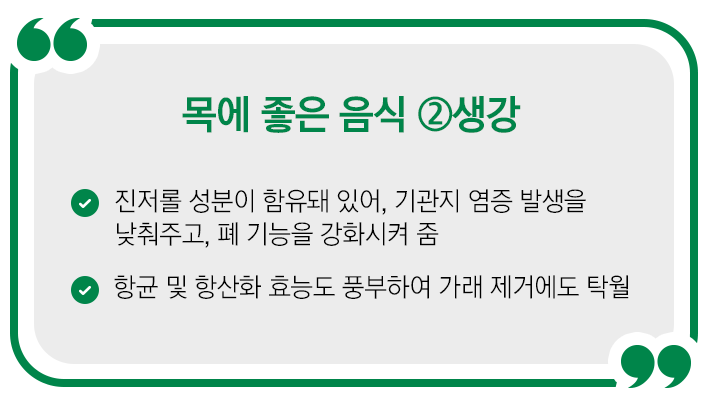 생강은 몸의 냉기를 내보내 주는 특성과 혈액순환을 촉진시켜주는 효과가 있어, 감기 예방에 탁월합니다. 또, 생강에는 진저롤 성분이 풍부한데요. 진저롤은 염증을 억제해 주는 성질을 갖고 있습니다. 그래서 기관지 염증 발생을 낮춰주고, 폐 기능을 강화해 줍니다. 항균 및 항산화 효능도 포함돼 있는데요. 염증과 가래 제거에 특효고요. 목감기 기침을 잦아들게 해줍니다.
