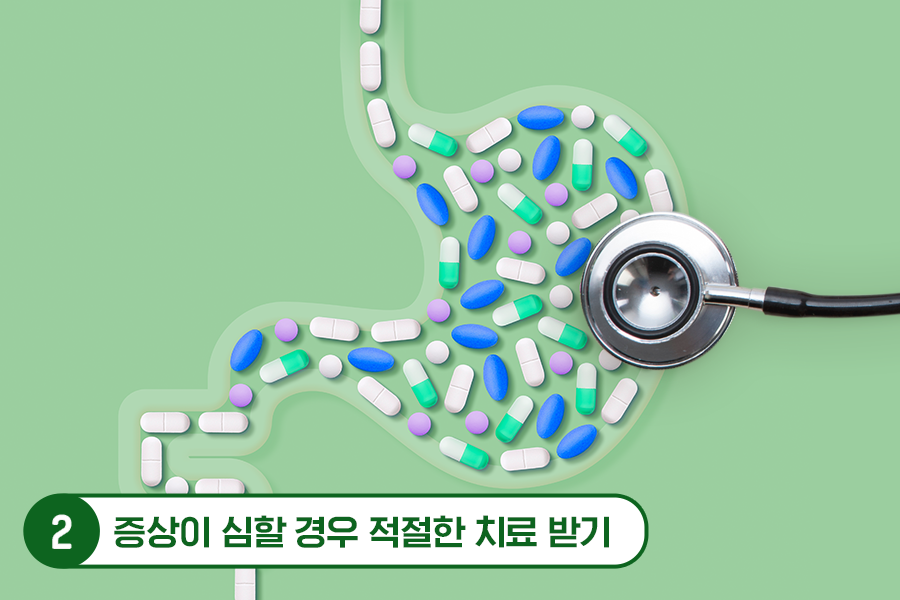 생활 습관 변화로 증상이 호전되지 않을 경우 병원 진료를 통해 적절한 치료를 받아야 합니다. 의사나 약사의 처방 없이 진통 소염제를 남용하는 것은 금물! 위염은 위산 분비 억제제와 위점막보호제를 복용하거나, 헬리코박터균 진단 시 항생제 치료로 악화를 방지할 수 있습니다. 역류성식도염은 증상이 심한 경우 느슨한 하부 식도괄약근을 조이는 수술적 치료법이 필요할 수도 있습니다.