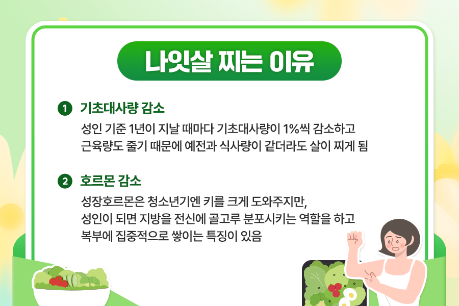 나잇살이 찌는 이유는 크게 두 가지입니다. 첫 번째는 기초대사량 감소인데요. 나이가 들수록 근육량이 줄어들게 됩니다. 그럼 자연스럽게 기초대사량도 함께 감소하죠. 실제로 나이를 한 살 더 먹을 때마다 기초대사량은 약 1% 감소한다고 해요. 30~49세 권장 칼로리가 2,000kcal라고 했을 때, 1년에 20kcal가 감소하는 거죠. 그럼 10년이면 200kcal가 감소하게 됩니다. 또, 남성보다 여성의 감소량이 좀 더 크기 때문에 중년 여성이 나이가 들수록 살이 더 찔 수 있죠.
