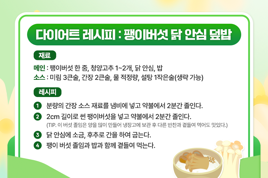 앞서 소개한 두 가지 재료인 팽이버섯과 닭 안심으로 만든 다이어트 요리를 소개합니다. 남녀노소 누구나 좋아하는 ‘팽이버섯 닭 안심 덮밥’입니다.