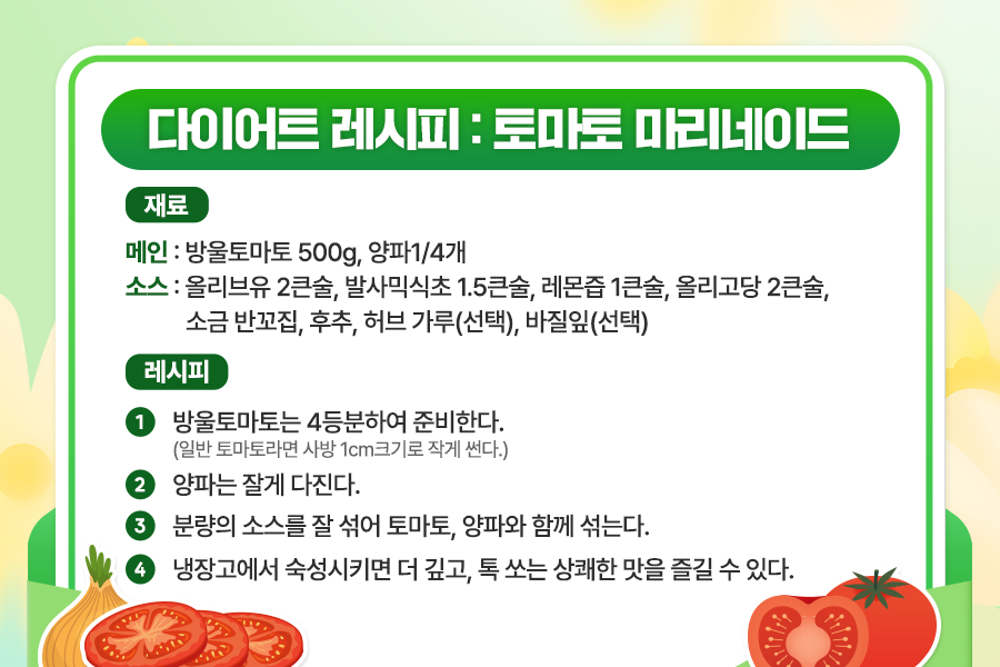 토마토 말고 자꾸 달콤한 과일에 손이 가시는 분들은 주목해 주세요. <토마토 마리네이드>는 입안 가득 퍼지는 새콤달콤한 맛이 자꾸만 먹고 싶어지는 중독성을 자랑합니다.