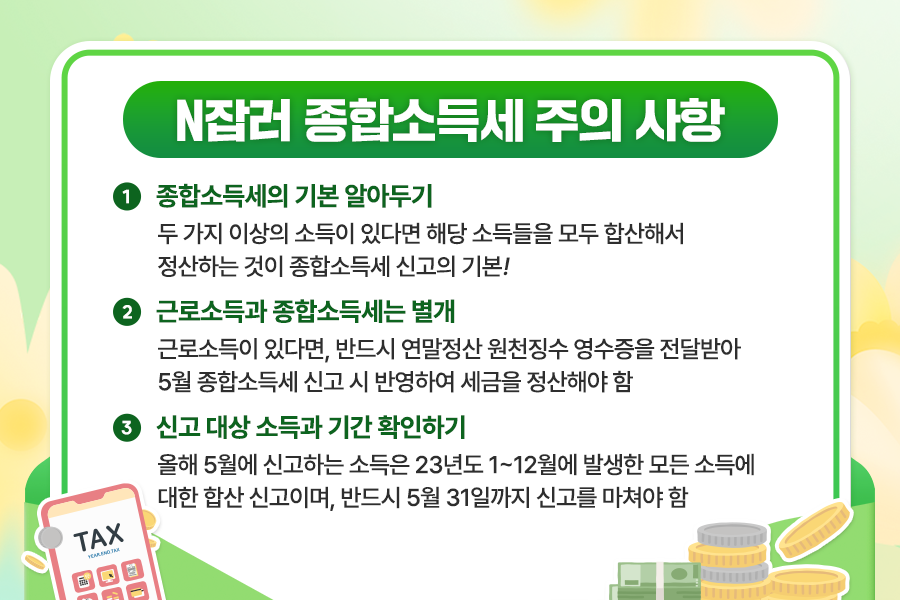 5월에 신고하는 소득이 23년도 소득인지, 24년도 소득인지 많이 헷갈려 하는데요. 23년도 1~12월에 발생한 모든 소득에 대해서 24년도 5월에 합산 신고를 하는 개념이라고 보시면 되고, 세금 신고와 납부는 5월 31일까지 반드시 마쳐야 한다는 점을 꼭 기억해야 합니다. 그럼 세금 신고에 있어서 불이익을 받는 일이 없을 겁니다.
