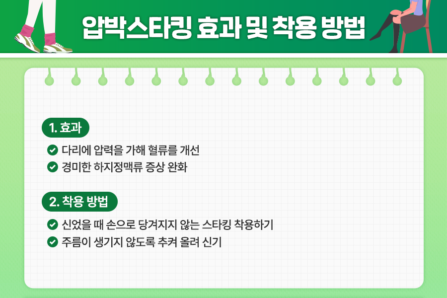특히 한곳에 오래 앉아 있거나 오래 서 있어야 하는 경우엔 꼭 착용하길 권장합니다. 압박 스타킹을 착용한 후에는 주름이 잡히지 않도록 항상 추켜올리고, 앉아 있을 때도 무릎 뒤로 주름이 생기지 않도록 무릎을 쭉 펴고 다리를 올린 상태를 유지해야 합니다.