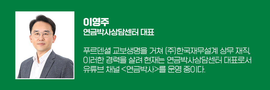 세계에서 가장 빨리 늙어가는 나라 대한민국에서 연금 제도와 상품은 점점 더 필수조건이 돼 가고 있습니다. 특히 연금은 소비를 목적으로 한 자산이므로 투자를 목적으로 한 부동산, 주식 등의 자산과는 현저히 다릅니다. 연금에 대한 인식 개선과 더불어 다양한 연금 포트폴리오를 통해 대한민국이 행복한 나라가 되기를 진심으로 기원합니다.