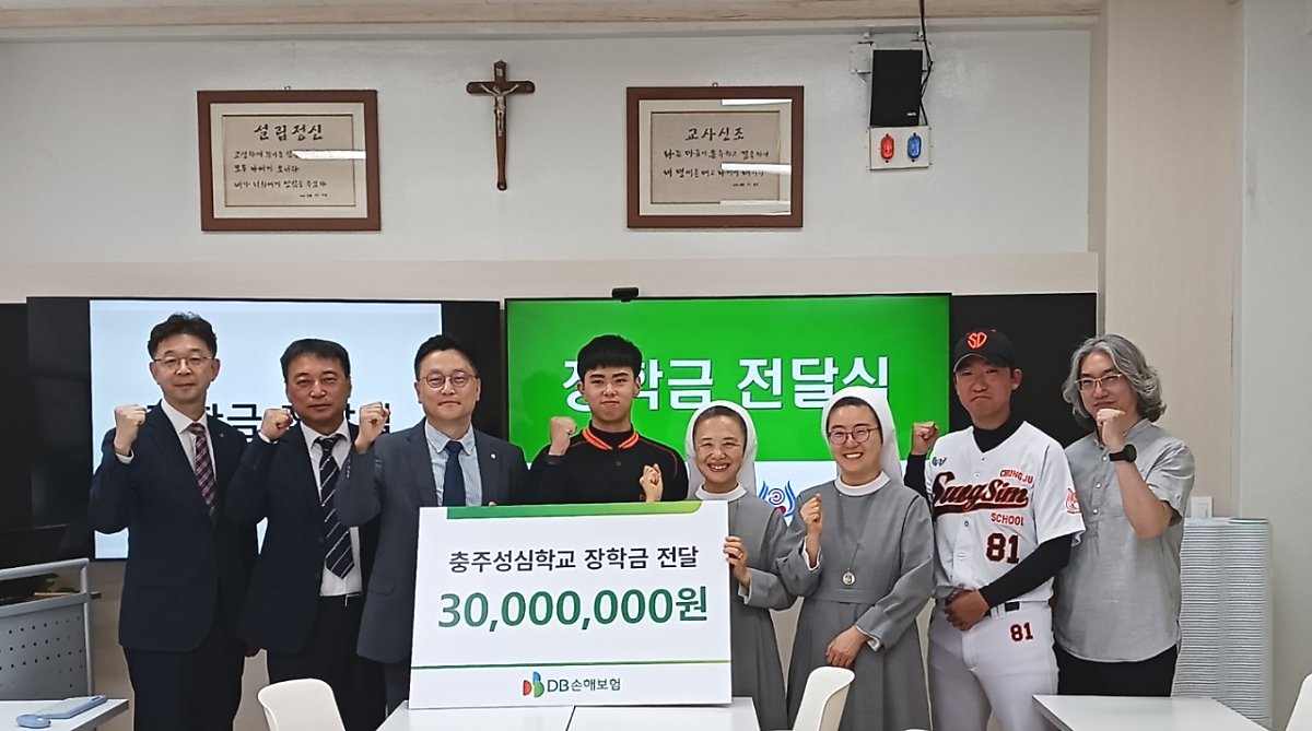 DB손해보험은 지난 11일 충주성심학교에서 DB손해보험 임직원, 충주성심학교 교직원 및 야구부 학생들이 참석한 가운데 가정형편이 어려운 학생들을 위한 장학금 3천만원의 전달식을 가졌습니다.