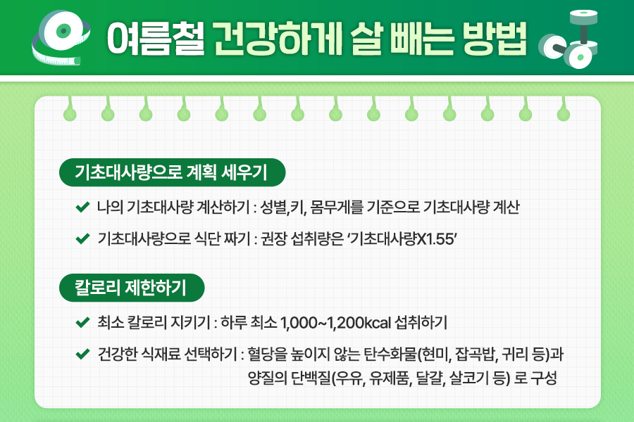 여름철은 높은 기온 탓에 온열 질환, 냉방병 등에 걸리기 쉽고, 잠을 깊이 자기 어려운 계절이에요. 또 여름철 무리하게 단식하는 경우 빈혈로 쓰러질 수 있는데요. 즉 여름철 무리한 운동과 칼로리 제한은 오히려 건강을 해칠 수 있어요.