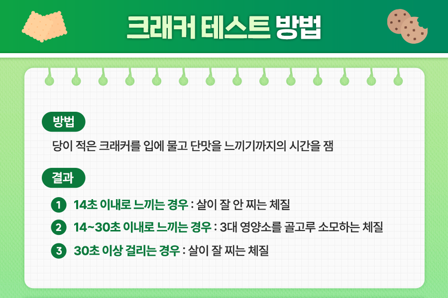 일반 사람들은 본인이 살이 잘 찌는 편인지, 혹은 그렇지 않은지 잘 모르는데요. 이를 간단히 확인하기 위해 만들어진 테스트가 바로 ‘크래커 테스트’입니다.