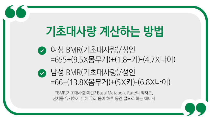 우리 몸이 하루 동안 필요로 하는 에너지인 기초대사량은 아래 방법을 통해 계산해 볼 수 있어요.