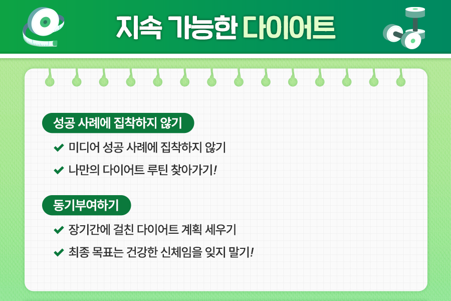 우선 지속 가능한 다이어트를 하기 위해서는 미디어의 성공 사례에 과하게 집착하지 말아야 해요. 사람마다 신체적 조건, 생활 습관 등이 다 다르므로 잘 맞는 다이어트 방법도 다를 수 밖에 없어요.