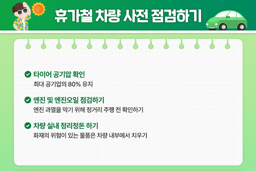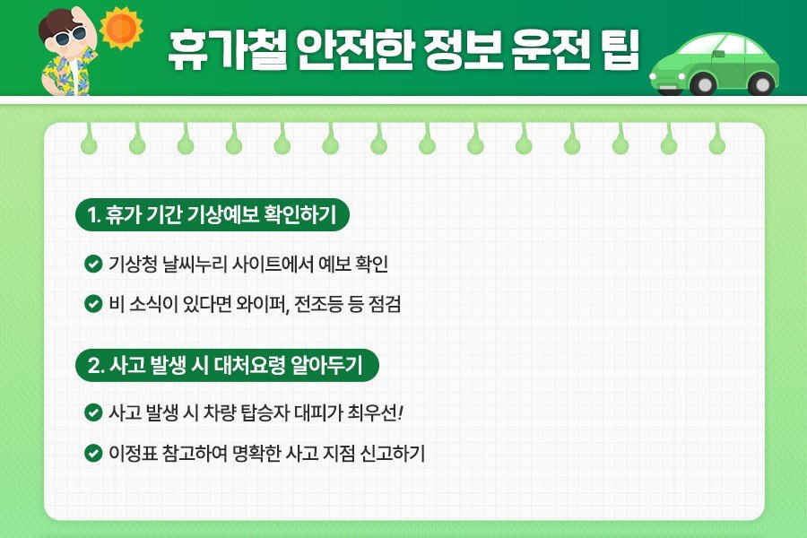 즐거운 마음으로 나선 여행길이 교통사고로 인해 악몽이 되는 건 생각만으로도 아찔한데요. 차량사전 점검과 교통안전 규칙 준수로 충분히 예방할 수 있으니 떠나기 전 꼭! 점검하기로 약속해요!