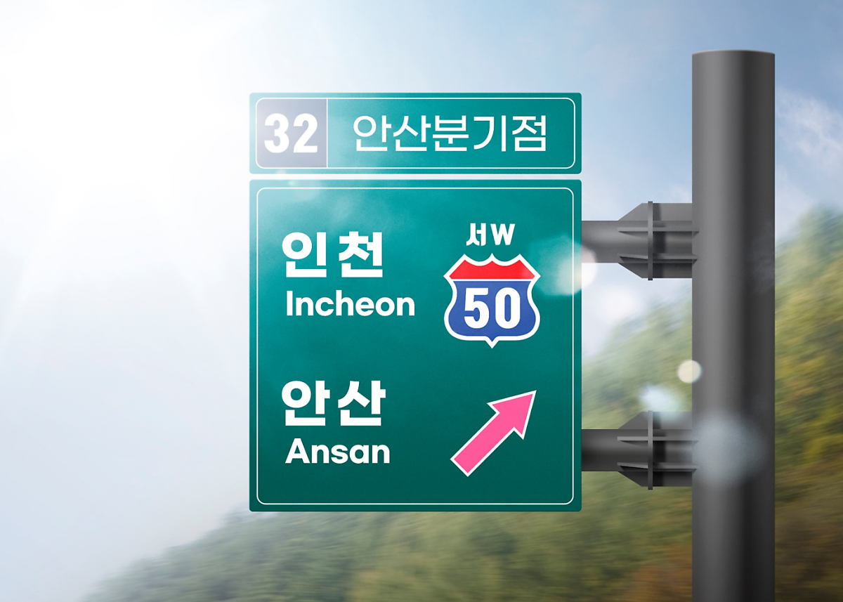 이정표는 기본적으로 상단의 작은 판과 아래의 큰 판 두개로 구성되어 있어요. 상단의 작은 판에는 분기점과 출구 번호가 표시되어 있습니다. 다시 말해 해당 분기점이 고속도로의 몇 번째 출구인지를 설명하는 것이랍니다.