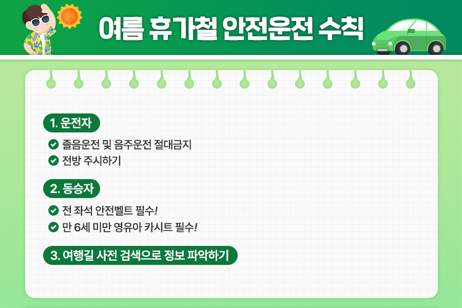 또 이동시간이 많은 휴가철에는 운전자뿐만 아니라 동승자 역시 교통안전 수칙을 알고 있어야 해요. 우리 모두의 안전하고 즐거운 휴가를 위해 아래 수칙을 잘 기억해 주세요 : )