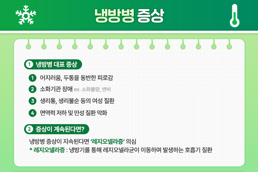 레지오넬라균은 냉각기를 타고 냉방 기기의 찬 공기를 통해 실내에 퍼지게 됩니다. 이 균은 특히 기관지가 약하거나 면역력이 떨어진 사람에게 독감이나 폐렴과 같은 증상을 일으킬 수도 있습니다. 냉방병으로 의심되는 증상의 정도가 심하거나 오래 낫지 않는다면 레지오넬라증을 의심할 수도 있습니다.
