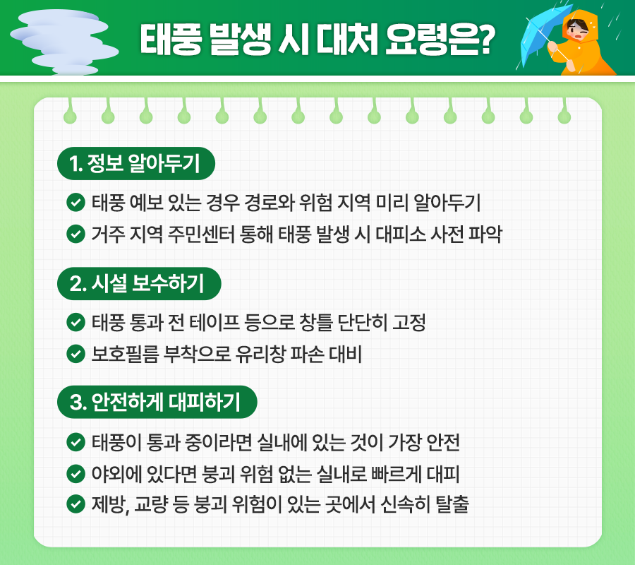 태풍 발생 예보가 있는 경우 태풍이 거주 지역을 통과하기 전 미리 시설을 점검해 두는 것이 안전합니다.