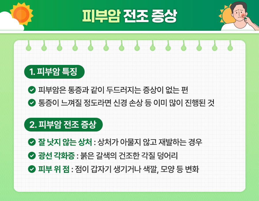 햇볕 노출부위에 피가 나고 딱지가 앉았다가 나은 후 다시 피가 나는 것이 반복되는 경우 피부암의 전조 증상으로 볼 수 있습니다. 또 점으로 생각되었던 부위에 반복적으로 상처가 발생하거나 오랫동안 치유되지 않는다면 기저세포암 같은 피부암을 의심해 볼 수 있습니다.