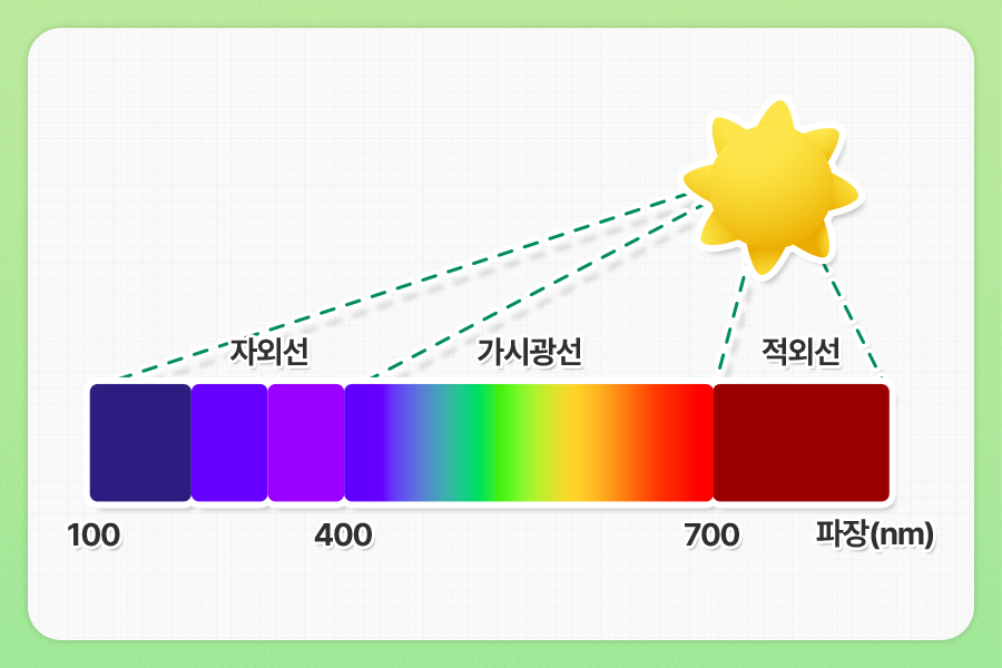 태양 광선은 자외선, 가시 광선, 적외선으로 나눌 수 있습니다. 그중 인체에 악영향을 끼치는 것은 자외선인데요. 자외선은 다시 A, B, C로 분류할 수 있습니다. 세 종류의 자외선 중 C는 파장이 짧아 피부에 미치는 영향이 거의 없는데요. 피부에 영향을 주는 두 자외선에 대해 알아보겠습니다.