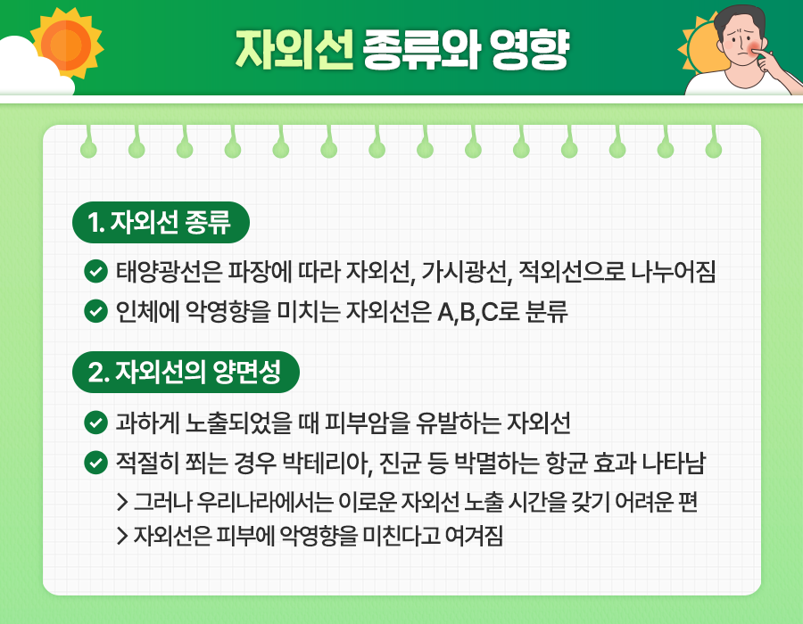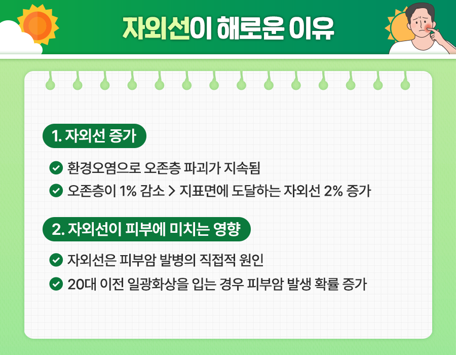 무더운 여름철 높은 기온만큼이나 ‘자외선’은 우리 생활에 영향을 주고 있습니다. 특히 지구 온난화 현상과 맞물려 최근에는 5~6월부터 낮의 온도가 25도를 웃돌고 있는데요. 기온이 높아진 만큼 햇빛 속 자외선도 강해져 피부에 영향을 주고 있습니다.