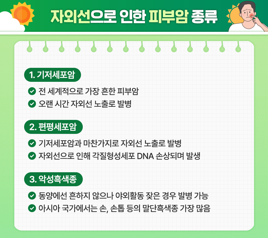 자외선 차단의 중요성은 여러 미디어를 통해 익히 알려져 있습니다. 그러나 매일 생활하다 보면 간과하기 마련인데요. 여름철 자외선으로 인해 발생할 수 있는 피부암과 예방법에 대하여 알아보겠습니다.