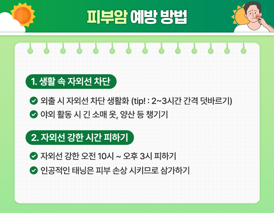 피부암을 예방하기 위해서는 자외선을 최대한 피하는 게 가장 좋습니다. 약 80%의 피부암은 햇빛으로부터 피부를 보호함으로써 예방할 수 있기 때문입니다.