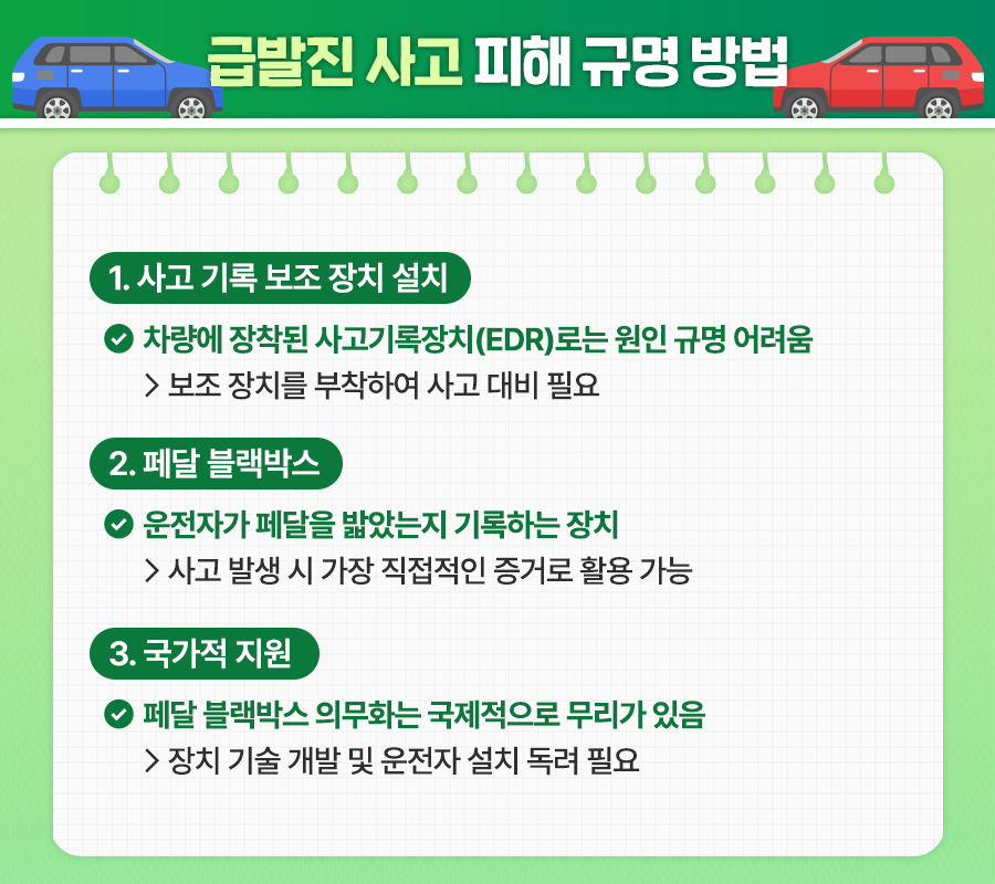 운전자의 조작 미숙으로 인한 사고는 EDR, 블랙박스, CCTV 등 다양한 장치를 통해 원인을 밝히기 쉬운 편입니다. 그러나 급발진으로 인한 사고는 원인을 명확히 밝히기 어려운데요. 자동차의 사고 기록 장치만으로 사고 원인 규명이 어려우므로 미리 보조 장치를 부착하여 사고에 대비할 수 있습니다.