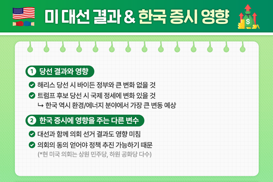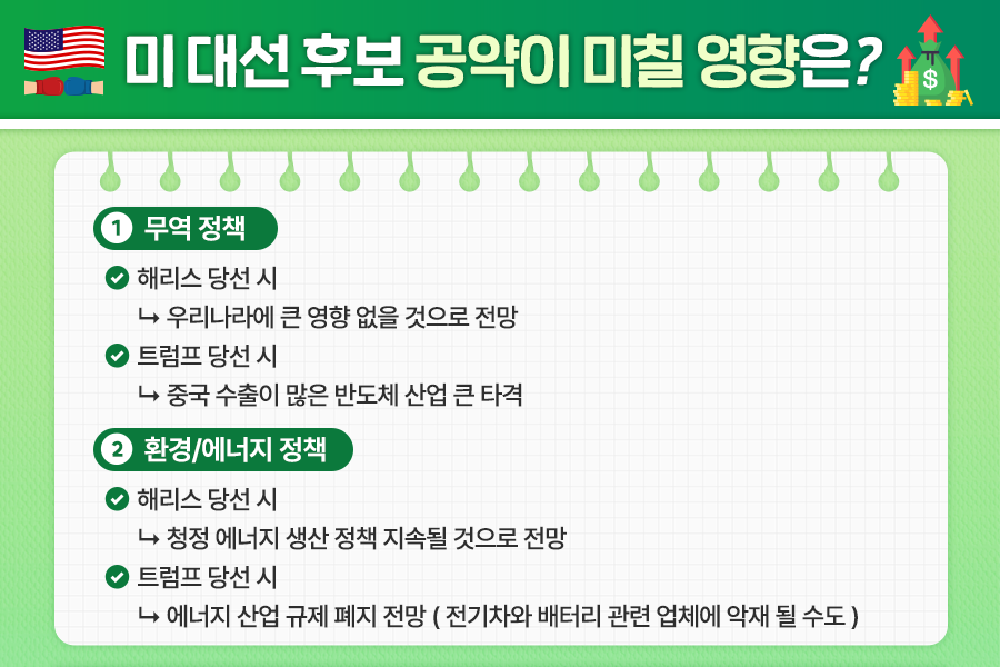 특히 전기차 배터리주인 LG에너지 솔루션, 삼성 SDI, 포스코퓨처엠, 에코프로비엠, 에코프로, 엘앤에프 등과 2차 전지 관련 주들도 일제히 강세를 기록했는데요. 더불어 SDN, 대명에너지, 씨에스윈드 등 신재생에너지 관련 주들도 초 강세를 나타냈습니다. 미국 대선이 이처럼 한국 증시에 큰 영향을 미치고 있는 이유는 크게 세 가지로 정리해 볼 수 있습니다.