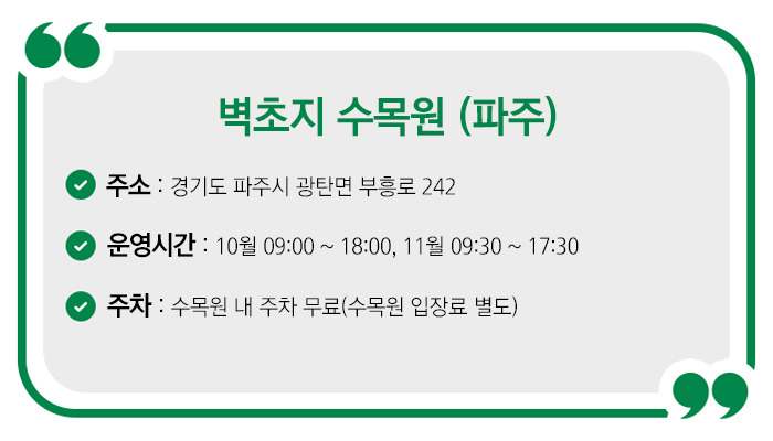 여러 정원 내에 이색 꽃이 가득한 경기도 파주시 벽초지 수목원은 매년 열리는 가을꽃 축제로 유명한 곳입니다. 가을 축제 동안에는 각종 희귀 국화를 판매하며, 국화가 가득한 플라워힐 포토스팟까지 운영한다고 하는데요.