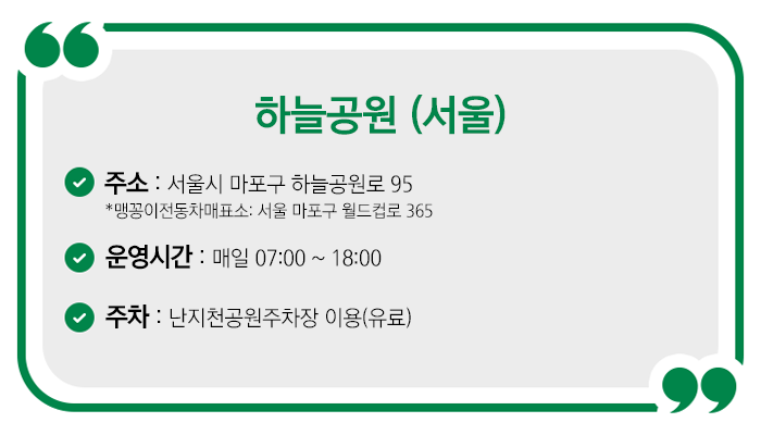 단 하늘공원까지 가기 위해서는 계단을 올라야 하는데요. 어린이나 노약자와 함께 방문하는 경우 ‘맹꽁이 전동차 매표소’에서 맹꽁이 열차를 타면 하늘공원 정상까지 편하게 올라갈 수 있답니다.