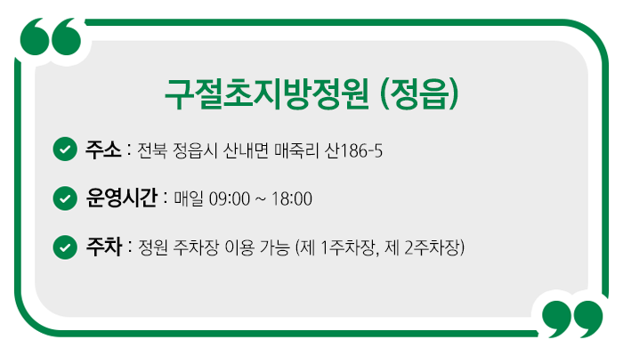 또 정읍 구절초지방정원은 구절초 뿐만 아니라 황화 코스모스, 백일홍, 코스모스 등 다양한 가을꽃을 만날 수 있는 곳인데요. 시간 내어 방문하시면 가을의 가장 아름다운 순간을 눈과 마음에 담아 오실 수 있으리라 생각됩니다.
