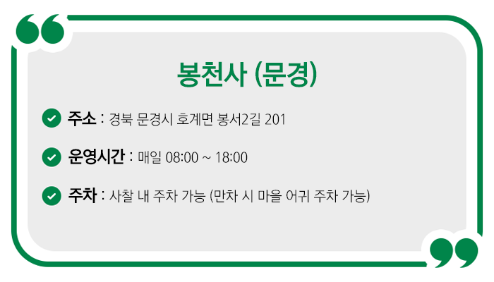 주변 관광지로는 문경철로자전거과 진남역, 고모산성 등이 있으니 문경으로 가을 여행을 떠나는 것도 좋겠죠. 보랏빛 꽃밭이 있는 봉천사에서 2024년 세 번째 계절을 추억해 보시기를 추천해 드리겠습니다.