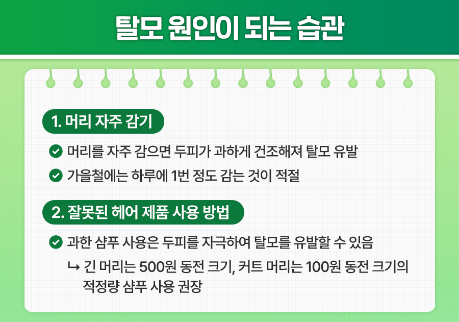 두피에 쌓인 각질은 환절기 탈모의 원인이 되는 만큼 두피를 깨끗하게 유지하는 것은 매우 중요합니다. 그러나 머리를 너무 자주 감는 경우 탈모가 생기거나 악화할 수 있습니다.