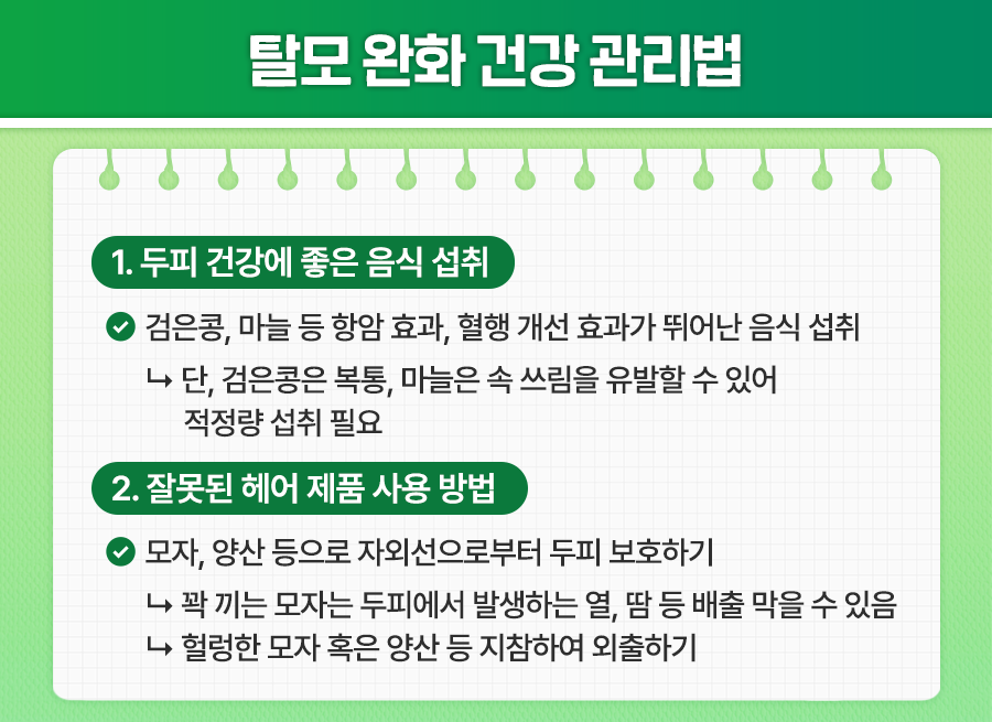 특히 검은콩, 마늘 등은 항암 효능이 뛰어나며 두피 혈행 개선과 모발 성장에 도움을 준다고 알려져 있는데요. 다만 너무 많이 먹는 경우 검은콩은 복통과 설사를, 마늘은 속 쓰림 등을 유발할 수 있으므로 매 끼니 적정량을 섭취하는 것이 좋답니다.