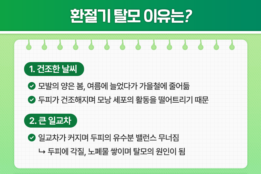 또한 낮과 밤의 큰 일교차 역시 탈모의 원인이 될 수 있습니다. 일교차가 커지면 두피의 유,수분 밸런스가 무너지며 각질이 발생하는데요. 더하여 가을철 일조량 감소로 남성 호르몬인 테스토스테론 분비가 일시적으로 늘어나며 모발의 성장을 막고 쉽게 빠지기 쉬운 상태로 만들 수 있습니다.