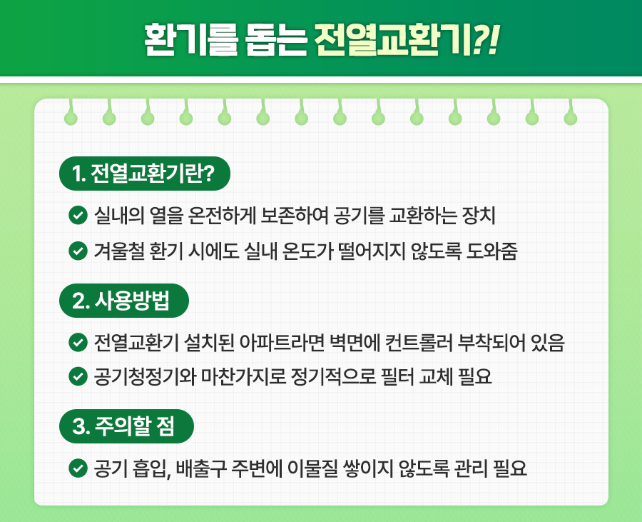코로나19를 겪으며 실내 공기질 관리에 대한 관심이 크게 늘었습니다. 특히 2006년부터 대단지 아파트에 의무 설치하도록 규제하고 있던 ‘전열교환기’가 최근 들어 주목받기도 했는데요. 2006년 이후 의무 사항이었으나 2020년대 들어서 크게 주목받게 된 ‘전열교환기’란 무엇인지, 어떻게 사용하는지 함께 알아볼까요?