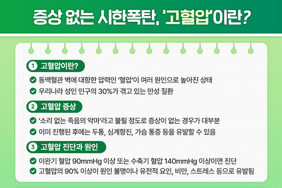 고혈압은 우리나라 성인 인구의 약 30%가 겪고 있는 질환으로, 상당히 많은 사람들이 겪고 있는 질환인데요. 만성 질환이라는 특성상 꾸준한 관리가 필요하지만 초기 증상이 거의 없어 방치되는 경우가 많아 더욱 심각한 문제로 여겨지고 있습니다.
