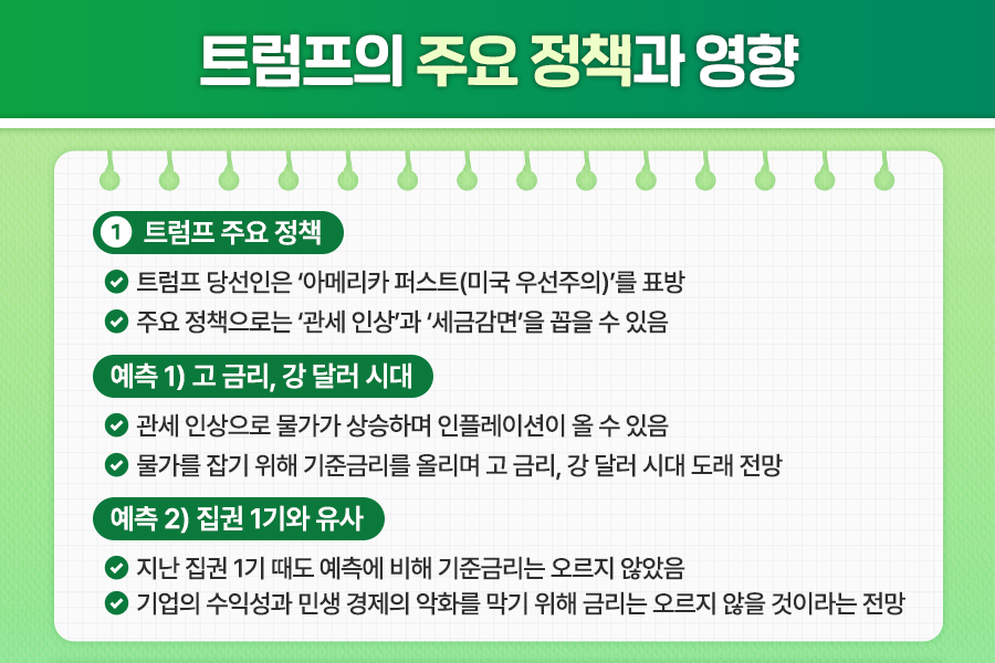 우선 트럼프 집권 이후로 ‘고 금리, 강 달러 시대’가 올 것이라는 우려와 걱정이 따르고 있습니다. 트럼프의 가장 중요한 경제정책을 꼽으라면 단연 관세 인상과 세금감면을 말할 수 있는데요.