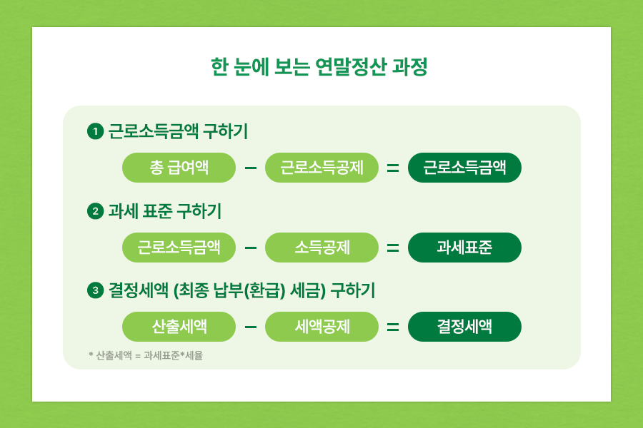 ① 총 급여액[연봉(연간근로소득)- 비과세소득] – 근로 소득 공제 = 근로소득 금액