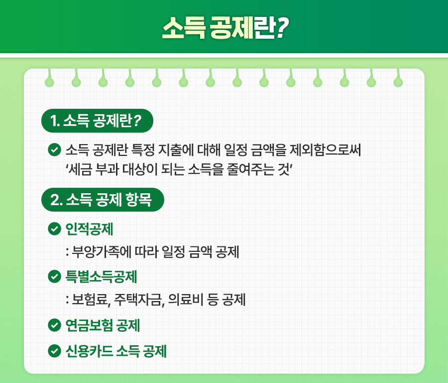 연말정산 세액을 결정하는 데 중요한 역할을 하는 ‘소득공제’란 특정 지출에 대한 일정 금액을 제외함으로써 ‘세금 부과 대상이 되는 소득을 줄여주는 것’을 말합니다. 소득공제 항목으로는 다음 4가지를 들 수 있습니다.