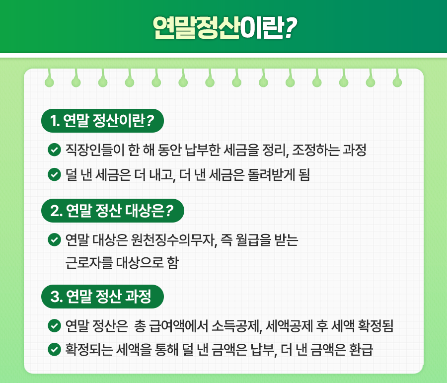 연말정산은 직장인들이 한 해 동안 납부한 세금을 정리하고 조정하는 과정입니다. 한마디로 "세금 정산"이라고 생각하면 되는데요. 매달 급여에서 세금을 미리 떼어가는데, 실제 소득이나 각종 공제 사항을 반영하지 못했을 가능성이 있기 때문에 연말정산을 통해 한 해의 소득과 공제 내용을 확인해 정확히 계산하는 것이랍니다.