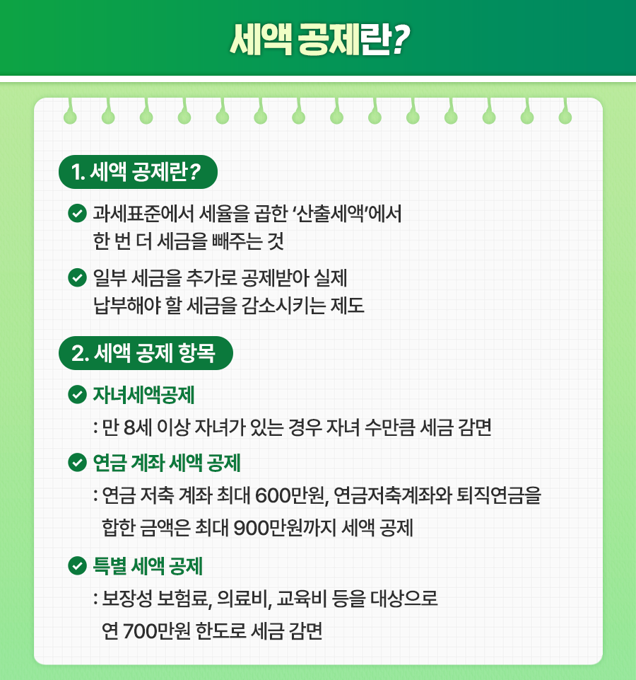위 과정을 통해 결정세액이 확정되어 ‘13월의 월급’을 받게 될지, 추가로 세금을 납부하게 될지 결정되는데요. 세금을 줄여 ‘13월의 월급’을 받을 수 있도록 핵심적인 역할을 하는 ‘소득공제’와 ‘세액공제’에 대해 좀 더 자세히 알아보겠습니다.