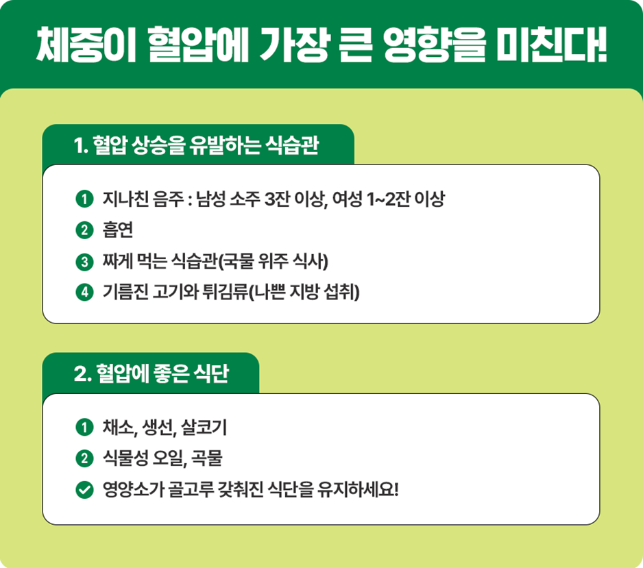 지나친 음주(남성 소주 3잔, 여성 1~2잔 이상), 흡연, 국물 위주의 짜게 먹는 식습관, 기름진 고기, 튀김류 등의 나쁜 지방 섭취가 지나치면 혈압이 올라가므로 주의해야 합니다.