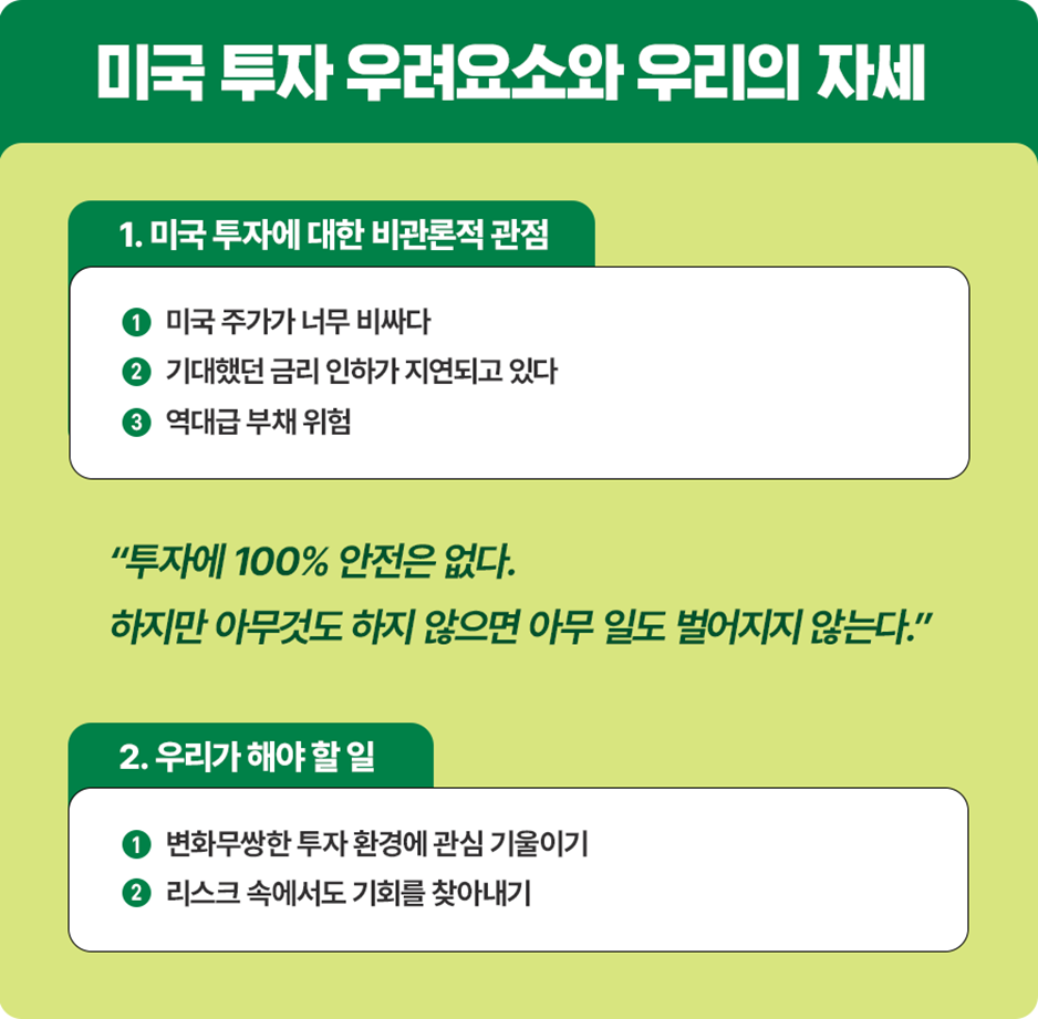 우려가 없는 것은 아닙니다. 미국의 주가가 너무 비쌉니다, 기대했던 금리 인하가 지연되고 있습니다, 역대급 부채 위험을 감내 가능한 것인가 등 비관론도 적지 않습니다.