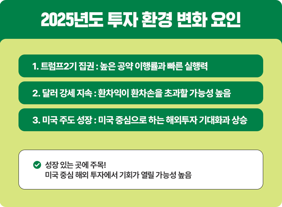 2025년은 어떨까요? 일단 구조적 흐름은 거스를 수 없을 것 같습니다. 성장이 있는 곳에 수익이 있다는 명제 때문입니다. 게다가 2025년 1월부터 시작될 트럼프 2기 집권은 미국을 중심으로 하는 해외투자에서의 기대효과를 높이고 있습니다.